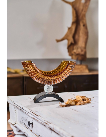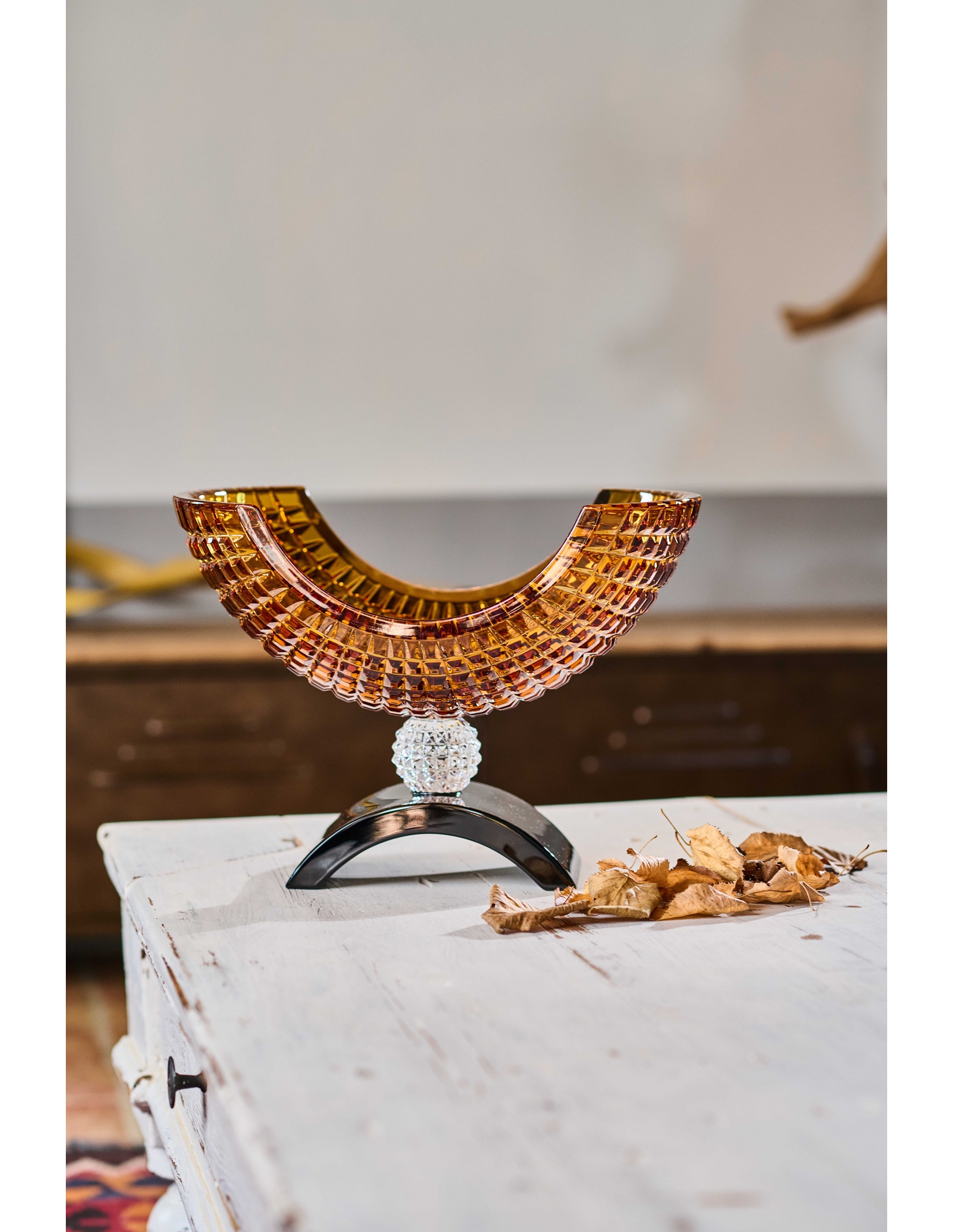 A centerpiece with the characteristic shape of the Diapason and an imposing size. The crystal side is traversed by a dense weave of vertical and horizontal engravings made entirely by hand by master engravers; the infinite facets deriving from them create a play of parallel prisms. As if in a crucible, the light collects and concentrates to then be poured onto the base in precious black crystal, a luminescent cascade radiating into the surroundings.