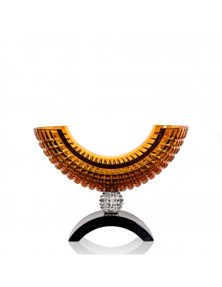 Un centro tavola dalla caratteristica forma a Diapason e dalle dimensioni importanti. L’alzata, in cristallo è percorsa da una fitta trama di tagli verticali ed orizzontali, realizzati interamente a mano da esperti molatori; le infinite sfaccettature che ne derivano generano un gioco di prismi paralleli. Come in un crogiuolo, la luce si raccoglie e si concentra per essere riversata sulla base, in prezioso cristallo nero: una cascata luminescente che si irradia nell’ambiente circostante.